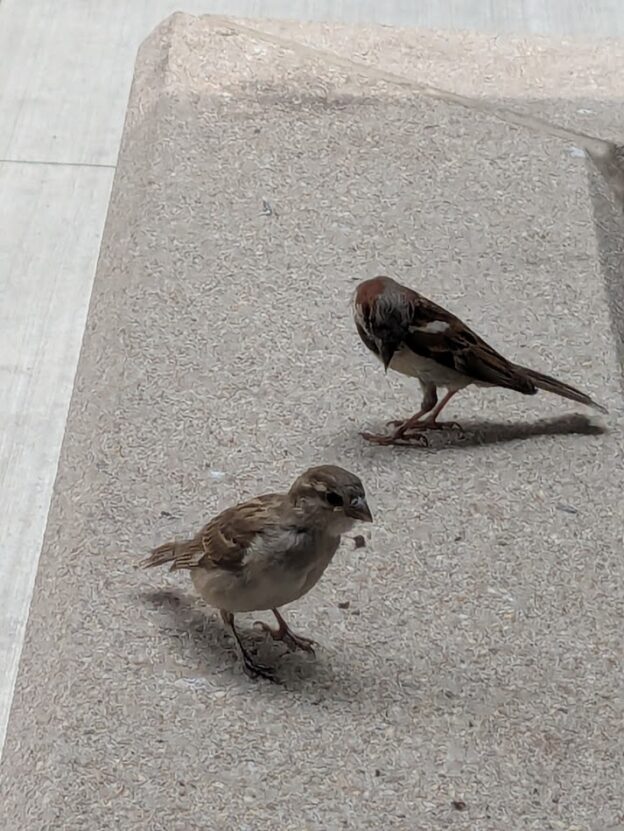 Hello sparrows I say to the sparrows that are sitting near feet away from me eating whatever they can scrounge.