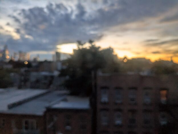 So the cloudy gray day has turned into a rainy gray day. The thing I’ve been doing at lunch time is going outside and enjoying a small cigar, not a mini cigar, but a small cigar, and I was hoping to do the same today. Looking east, it looks dry, but looking north, the window is coated with rain, and that has made the decision for me.